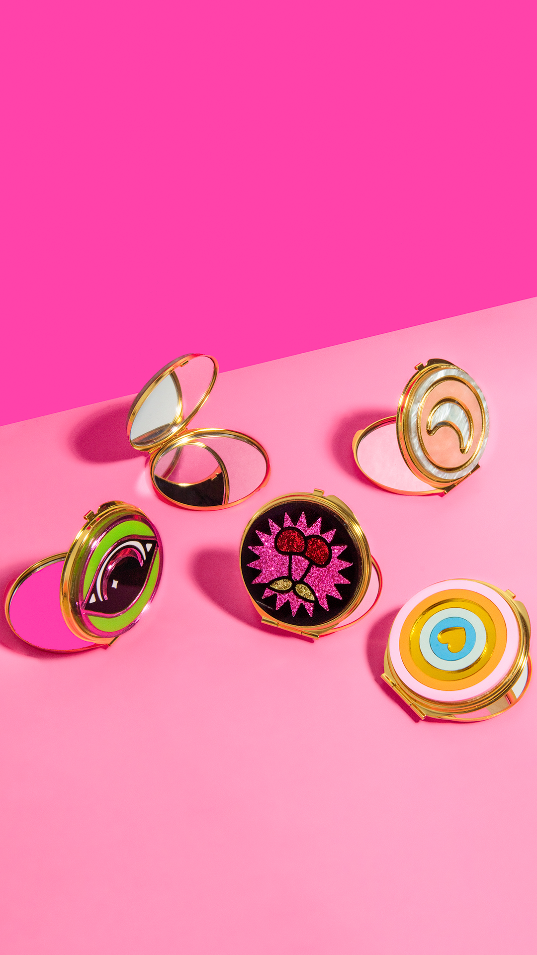 Dual-mirrored metal compacts embellished with handmade acrylic "Cherry Bomb" design.