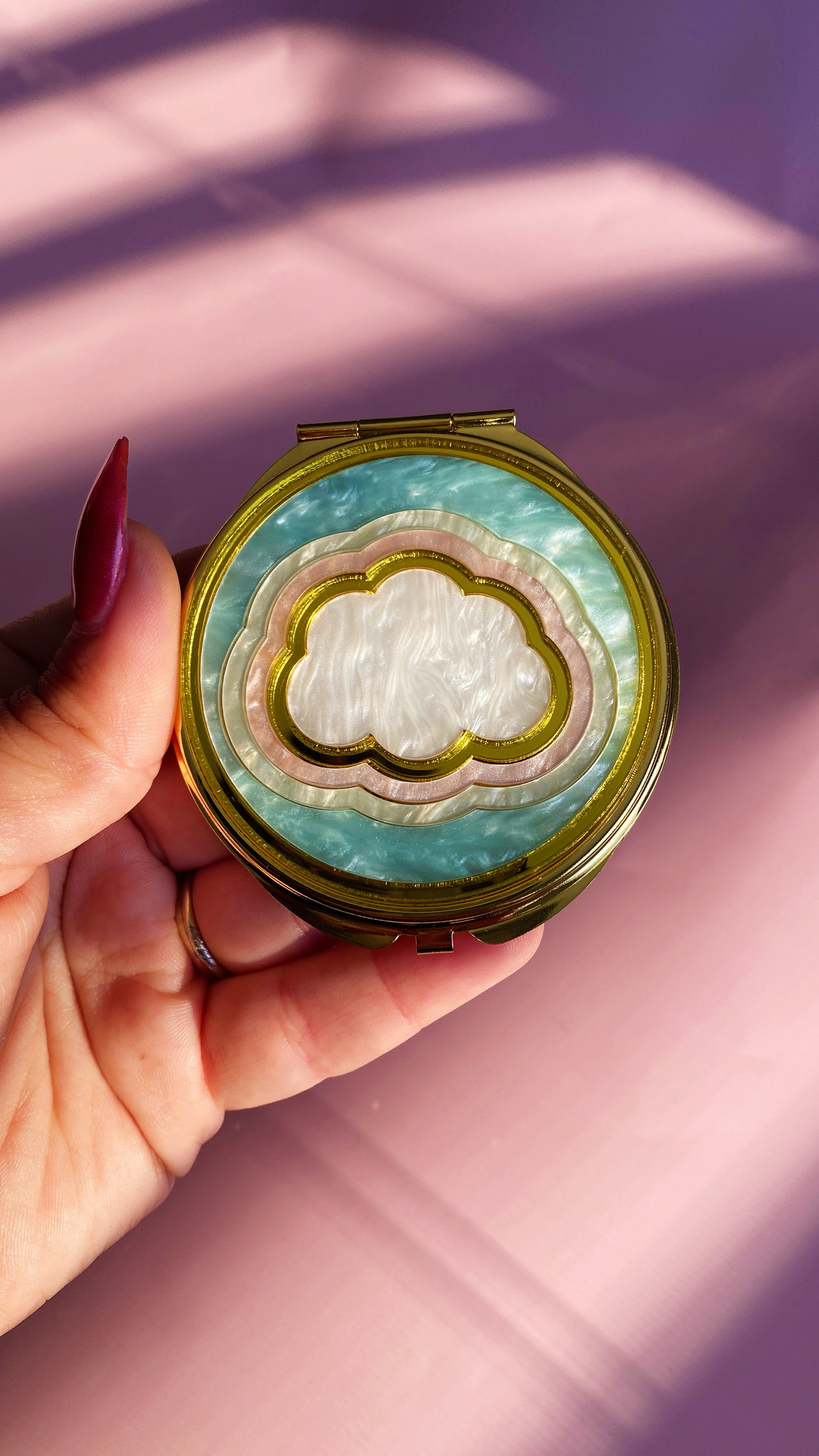 Dual-mirrored metal compacts embellished with handmade acrylic pastel cloud design.