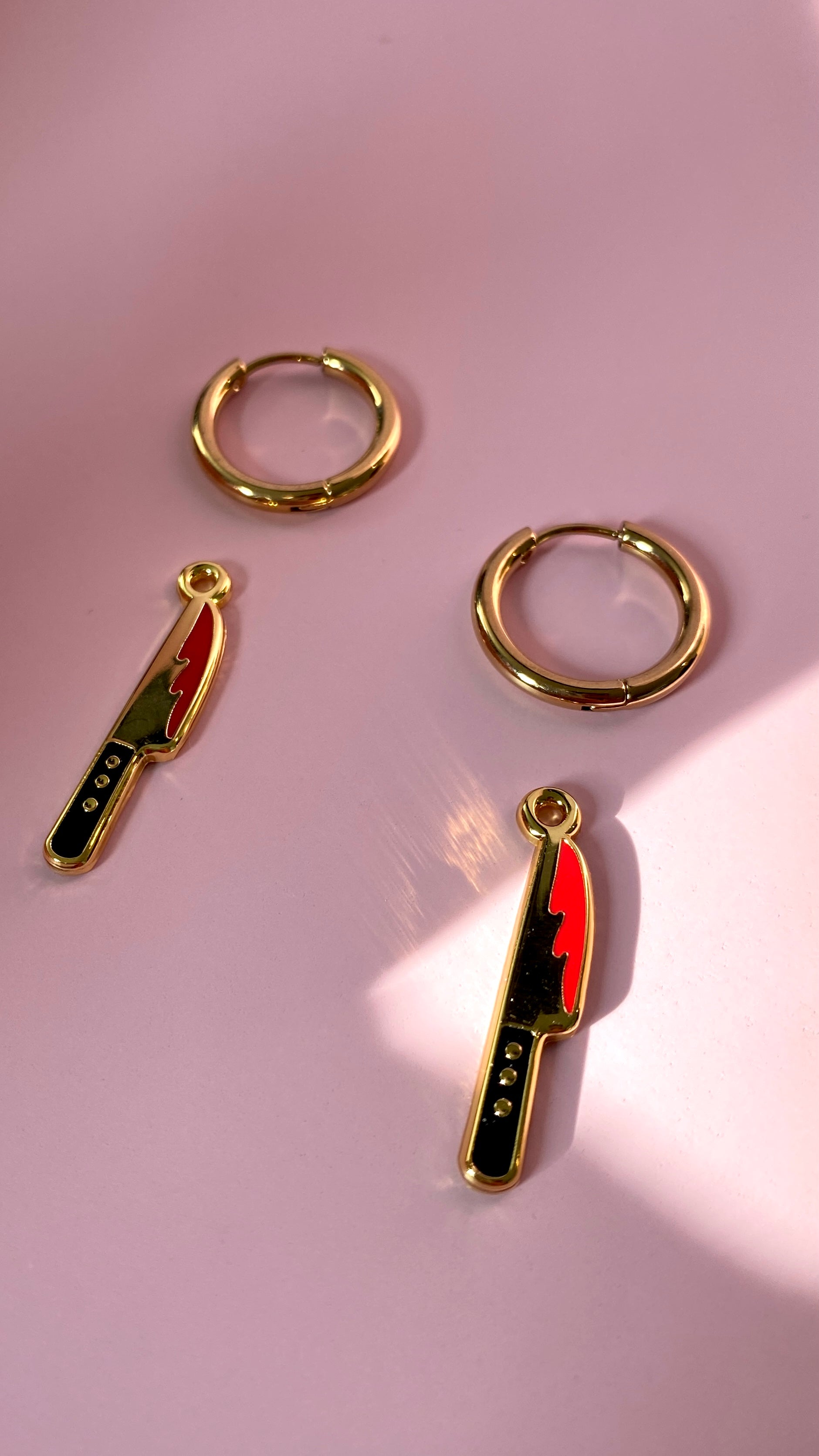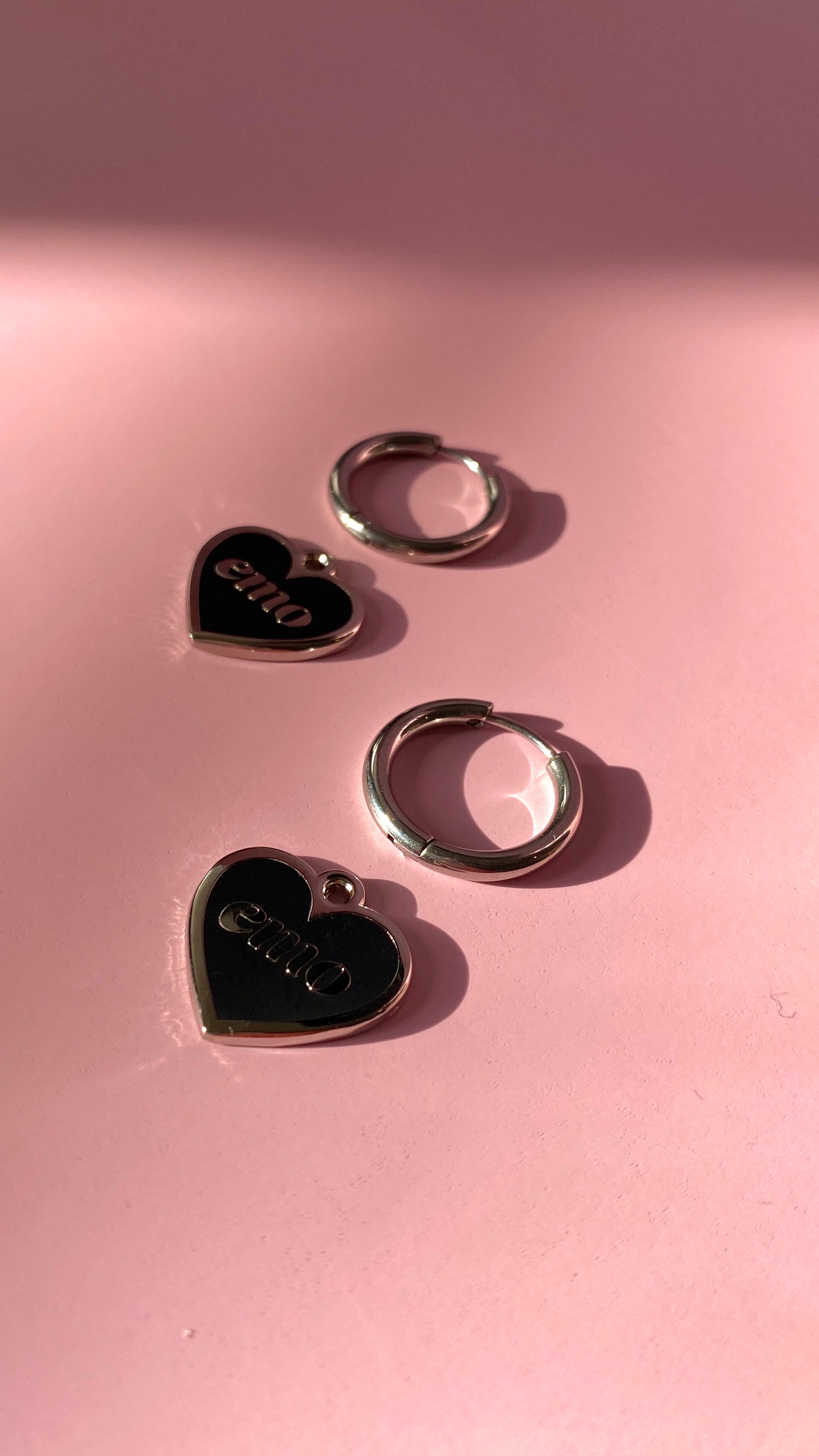 "Silver huggies with silver knife charms" OR "Silver huggies, one with a silver Spooky heart and one with a silver Emo heart"