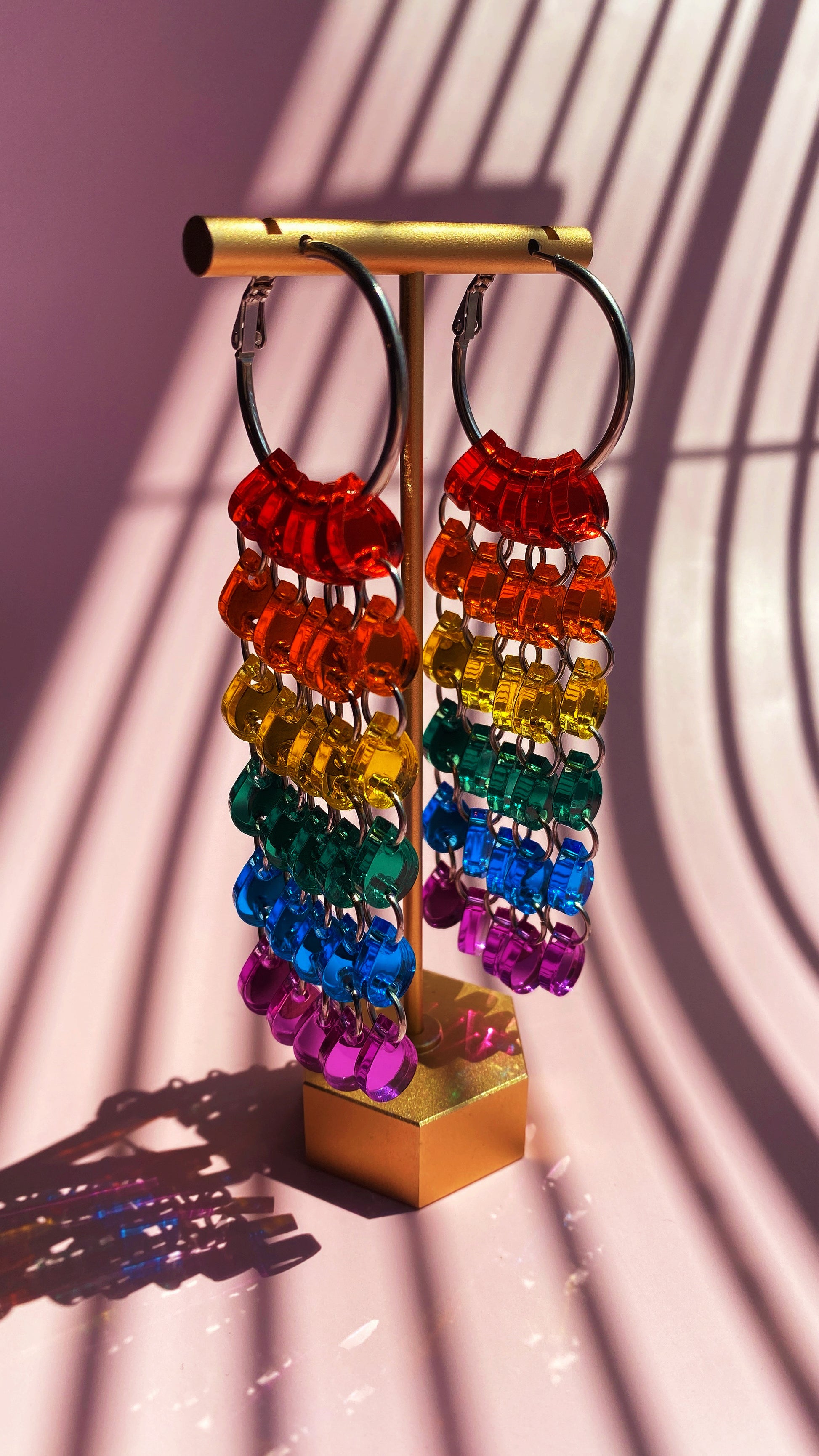 Be a walking rainbow disco with these statement hoops! Stainless steel silver hoops adorned with 5 strands each of rainbow rain drops. All handmade from shiny, mirror acrylic.