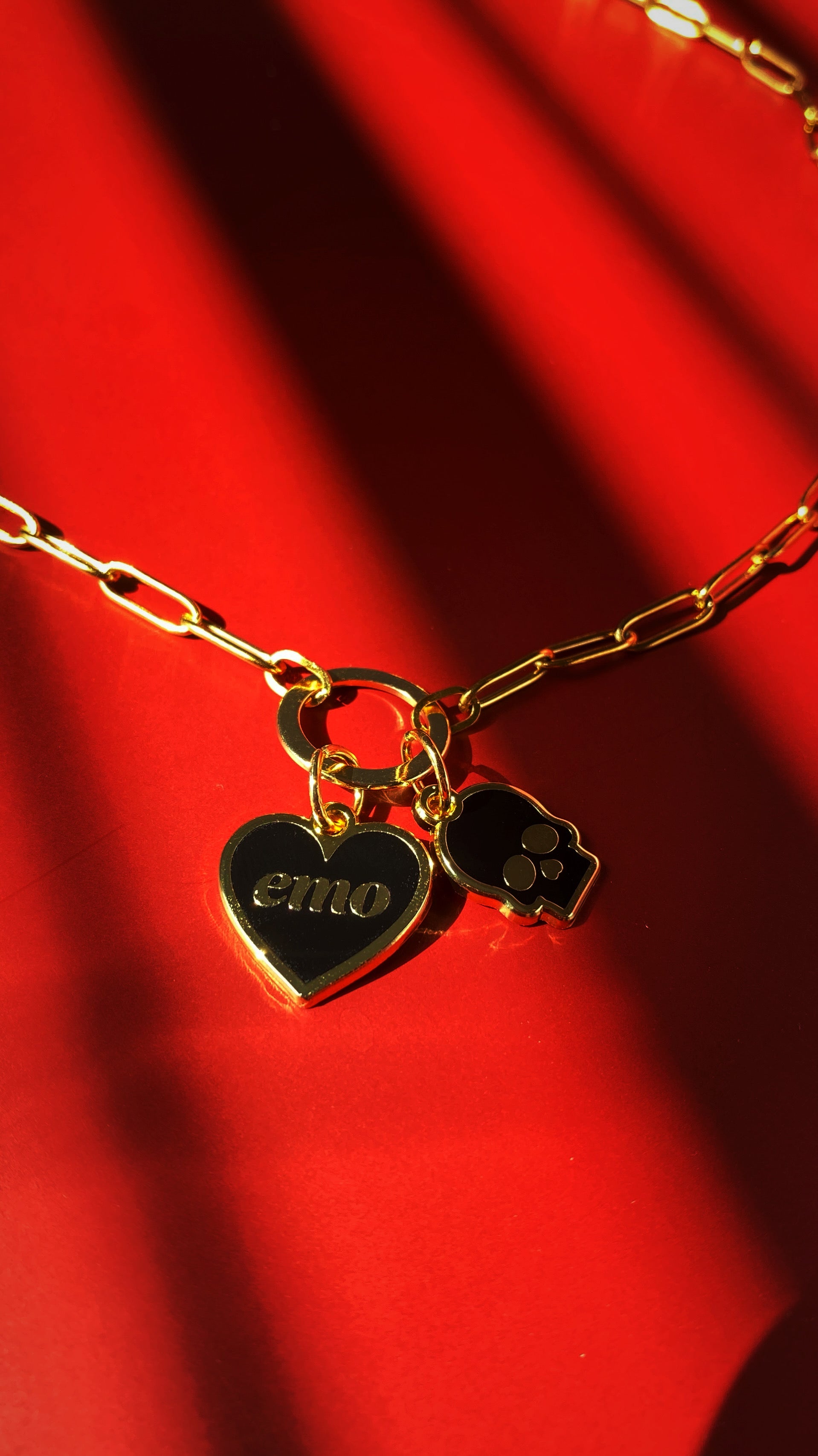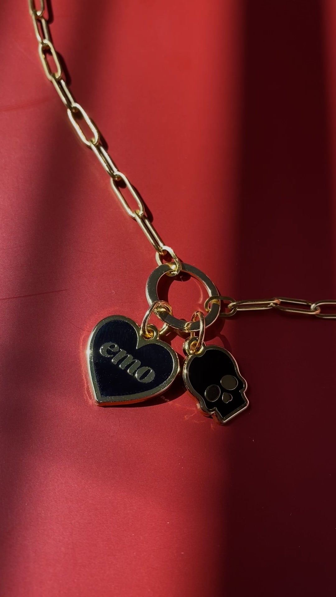 - Conversation heart style enamel charm with a matching skull enamel charm