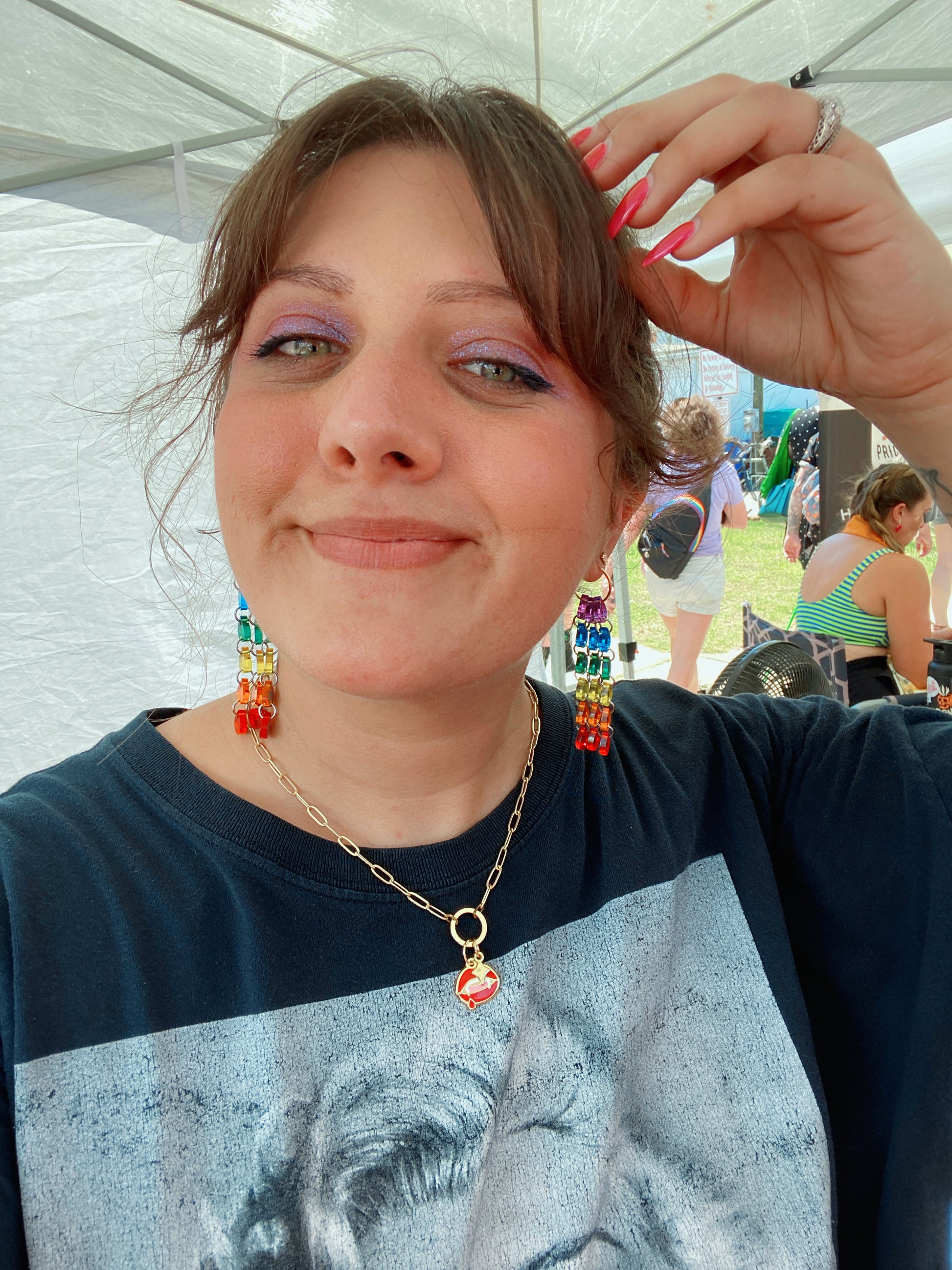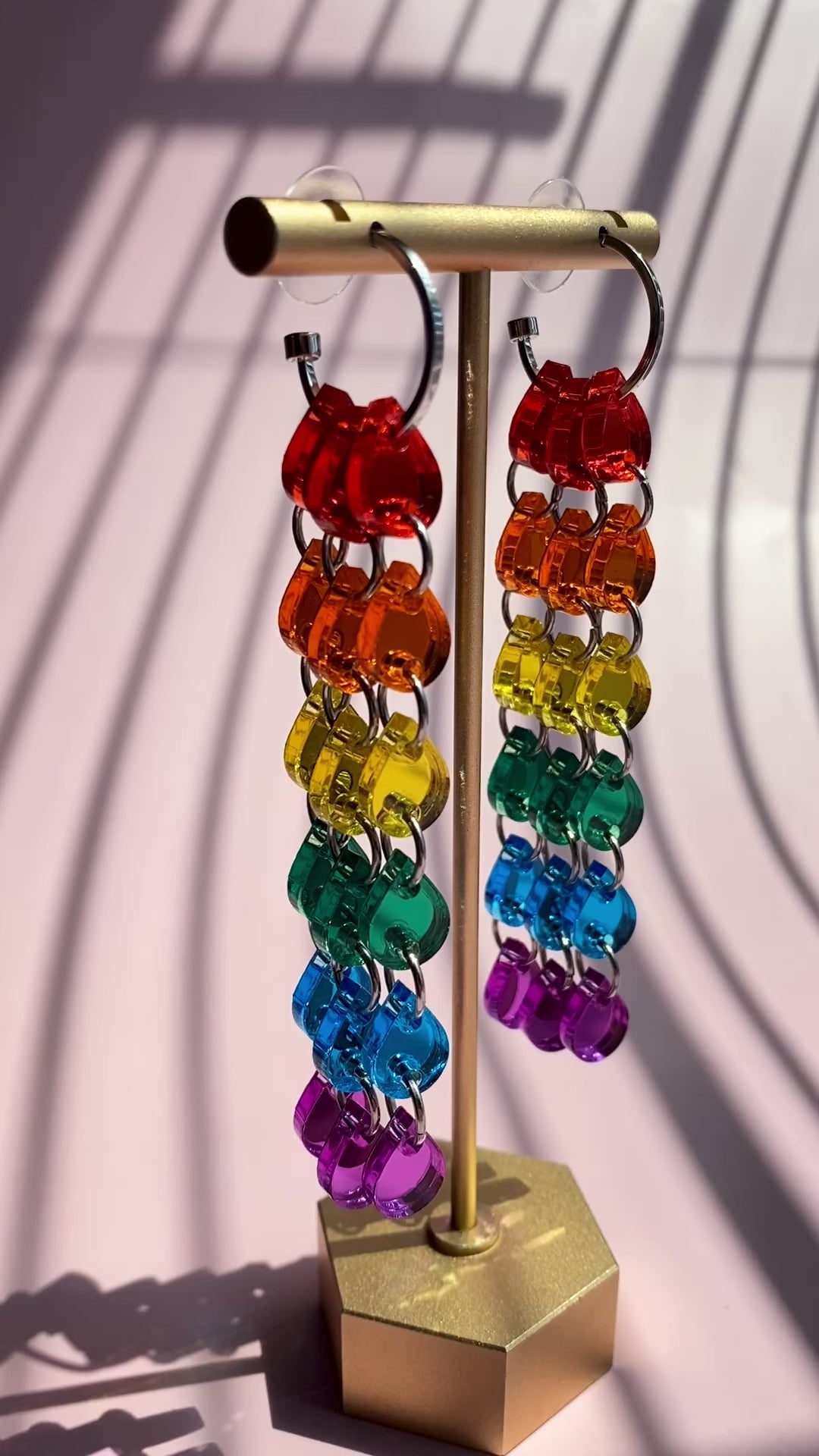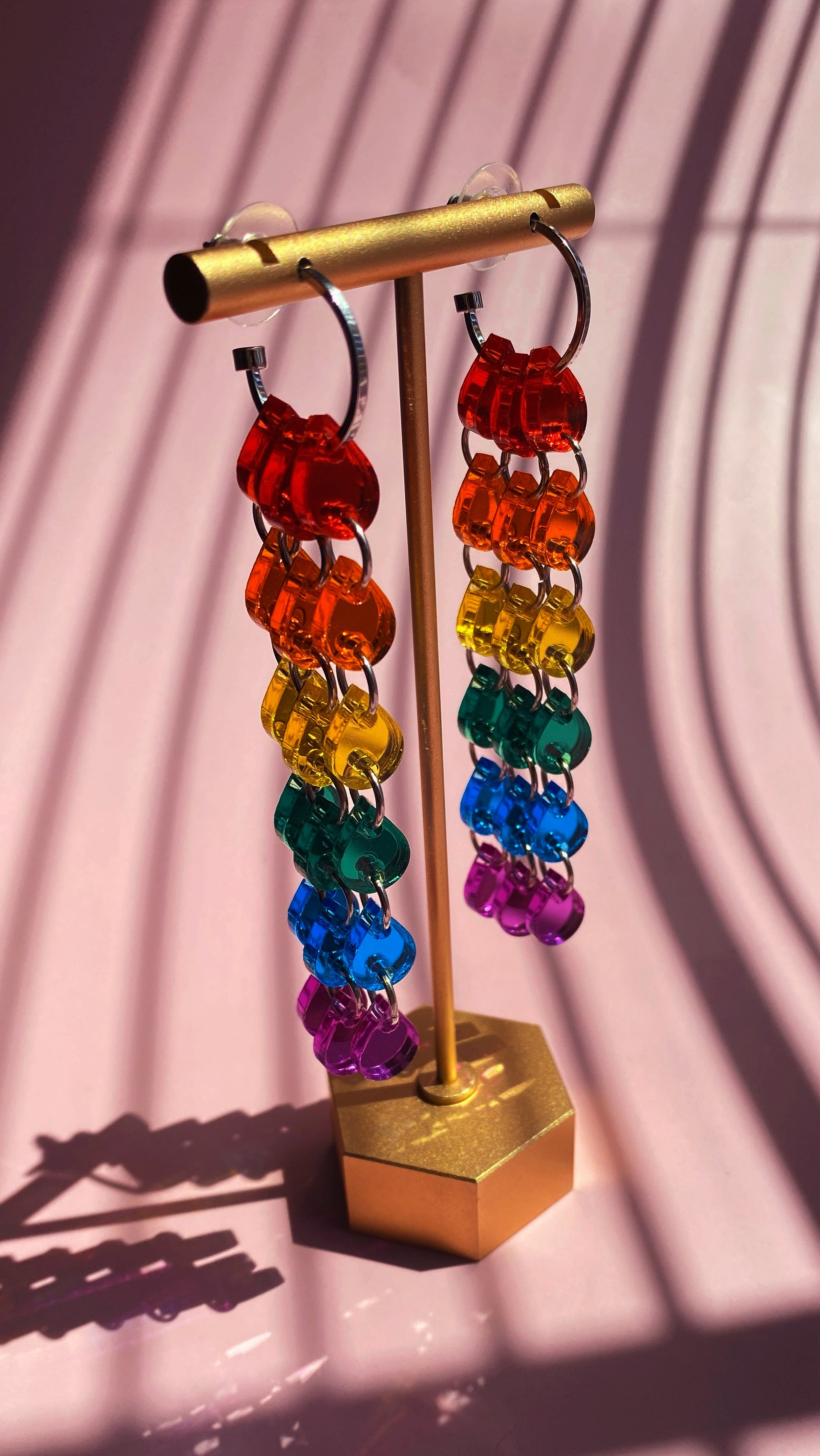 Be a mini walking rainbow disco with these semi hoops! Titanium silver semi hoops adorned with 3 strands each of rainbow rain drops. All handmade from shiny, mirror acrylic.