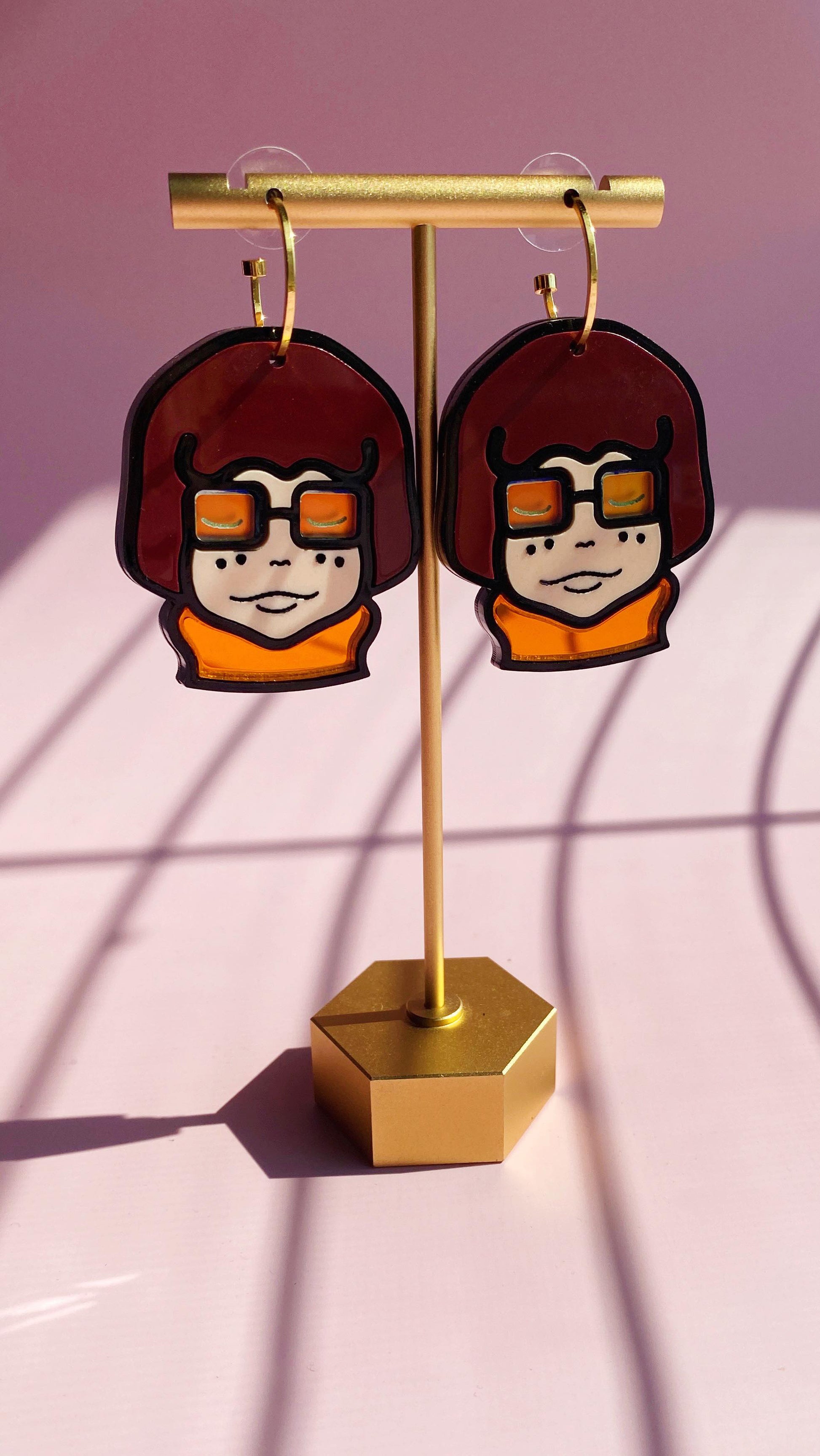 - Velma inspired character earrings. Featuring engraved & hand painted embellishments